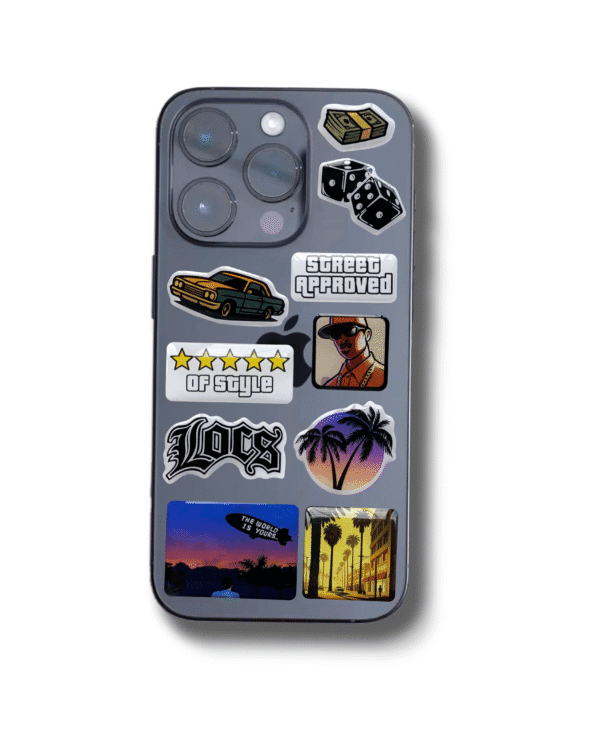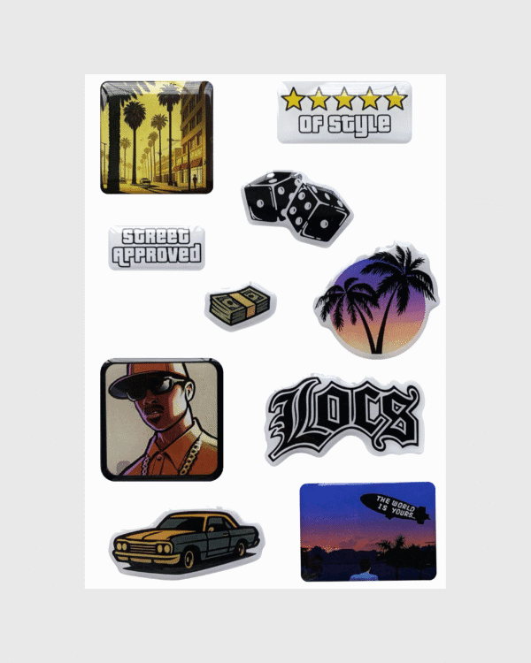 The “Street Style” sticker pack is a premium set of 3D stickers inspired by the urban vibe — palm trees, sunsets, street scenes, cars, and the iconic “The World is Yours” design.